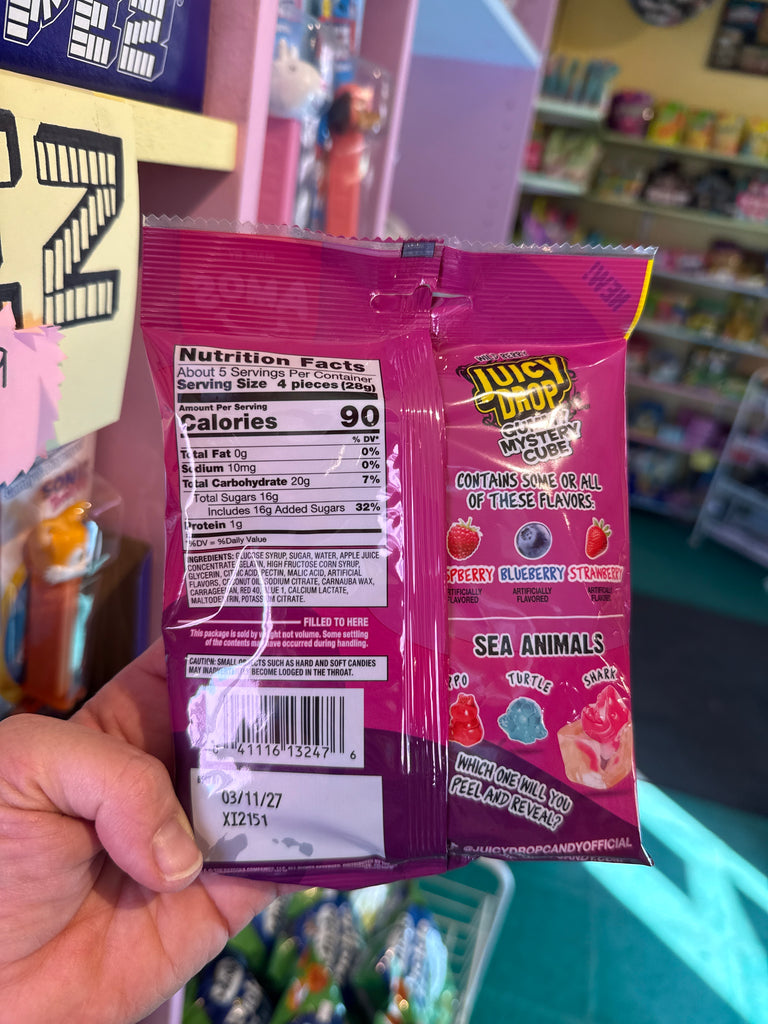 Peel and reveal! Gummy cube outside and mystery gummy inside.